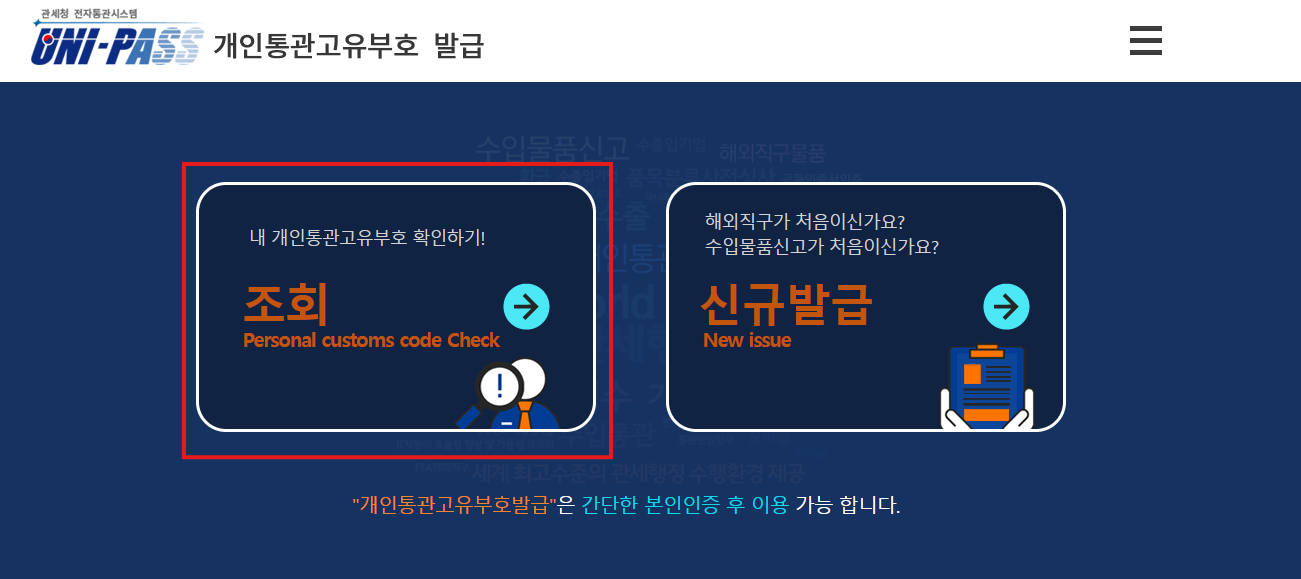 - '개인통관고유부호 발급' 메뉴 클릭