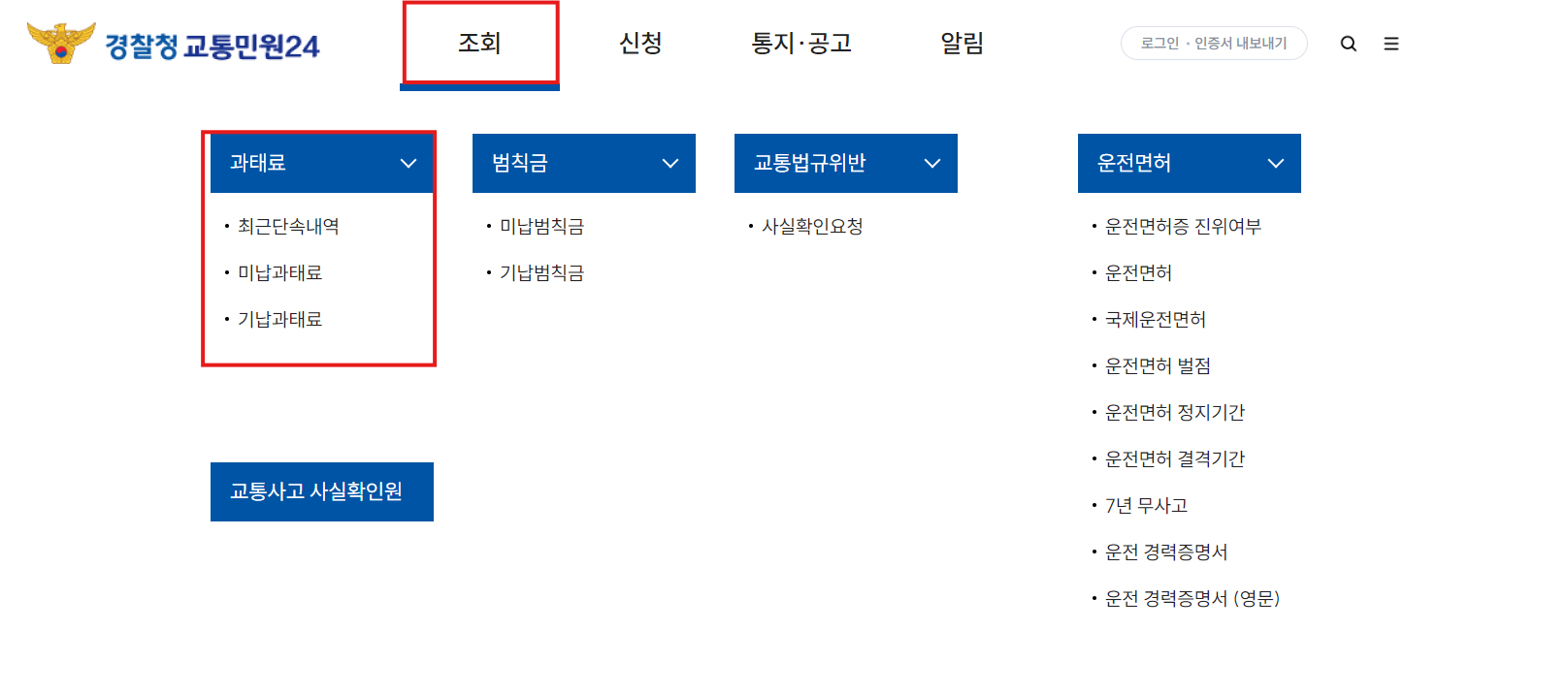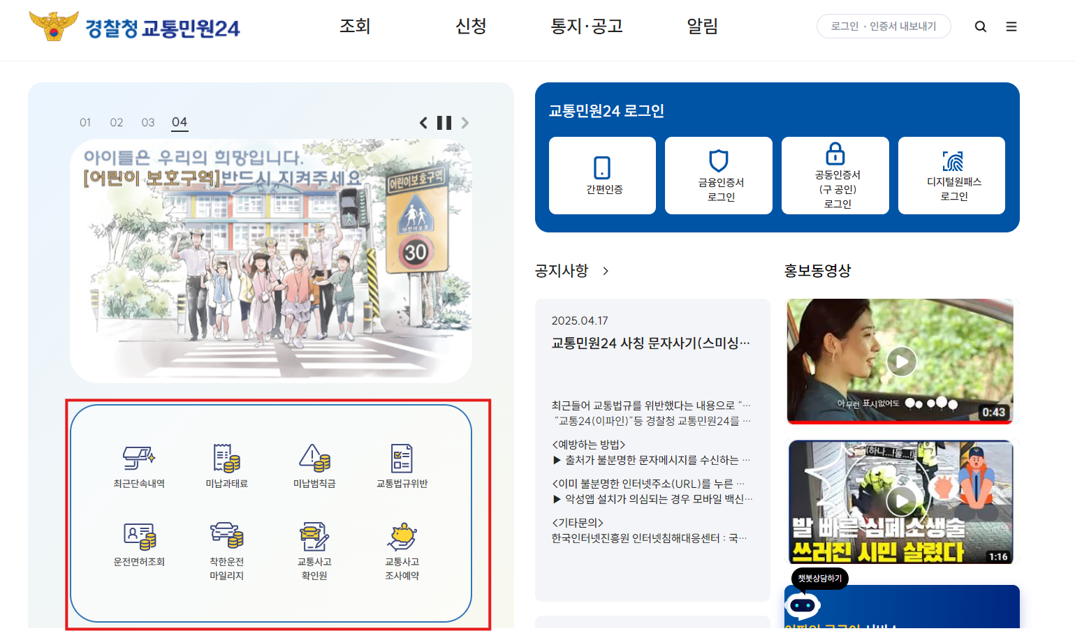 - 경찰청 교통 민원24(이파인) : 속도위반·신호위반 단속내역 조회, 과태료·범칙금 확인이 가능합니다.