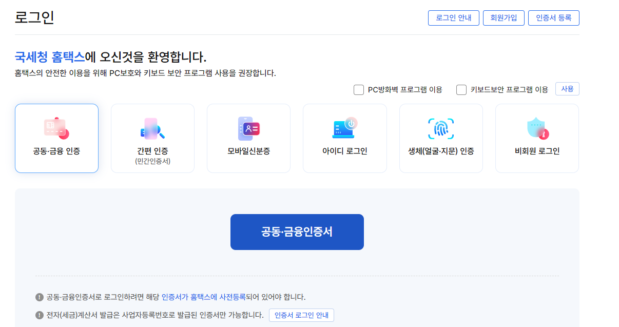 본인 인증을 위해 로그인합니다(공동 인증서, 간단한 인증 가능)